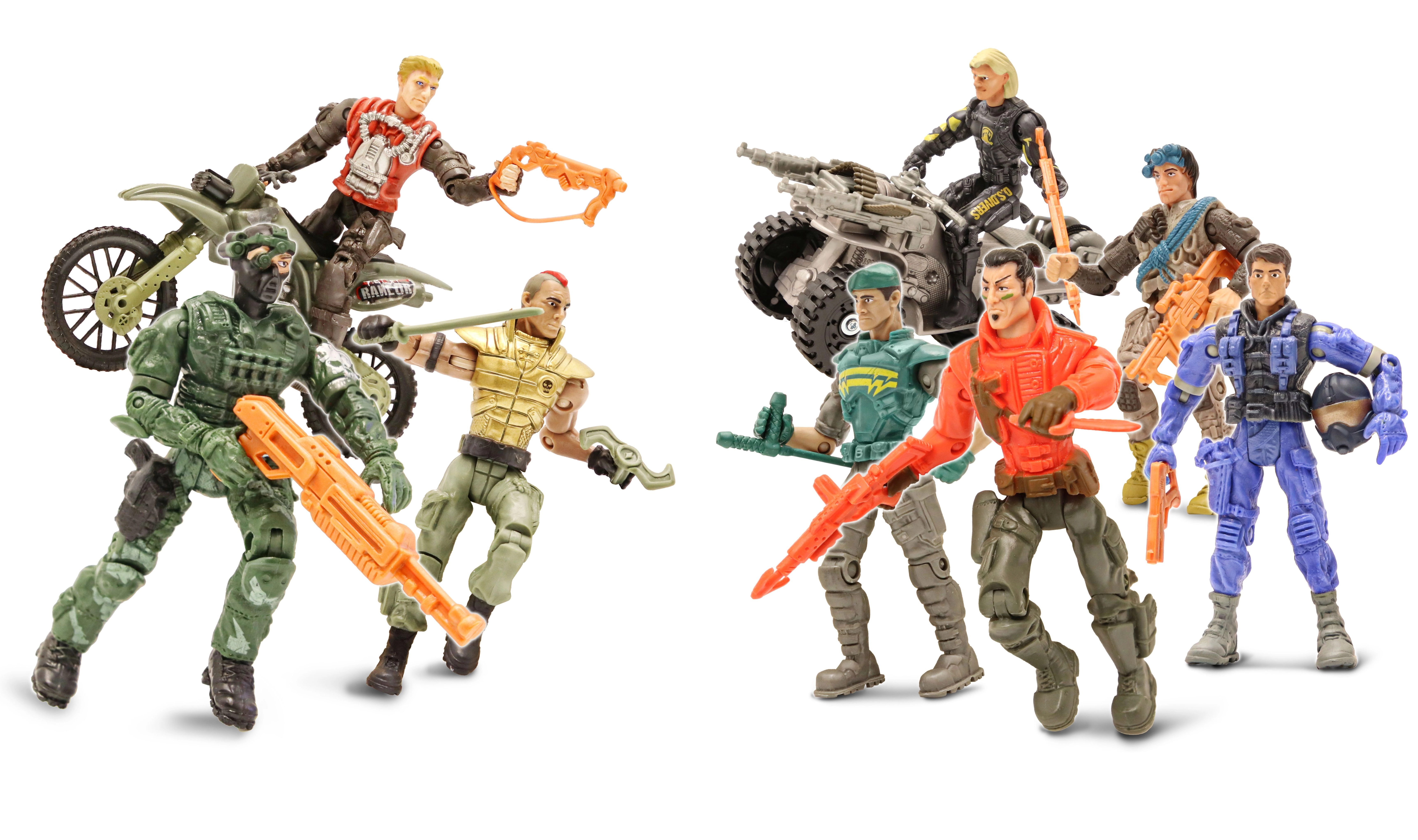 Action-sæt med lys- og lydeffekter, trækkroge og funktionelle led sikrer underholdning i timevis. Det er let at skabe egne dioramaer, baser eller konvojer – militærsæt, kampvogne, jeeps, lastbiler og skibe kan kombineres og udvides med tilbehør. Uanset om du søger det første udstyr til små soldater eller detaljeret militærteknik til samlingen, venter der kvalitetsrig, kreativ og realistisk leg.