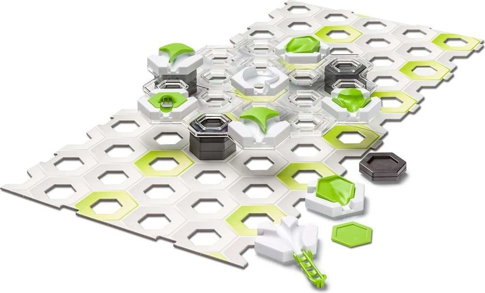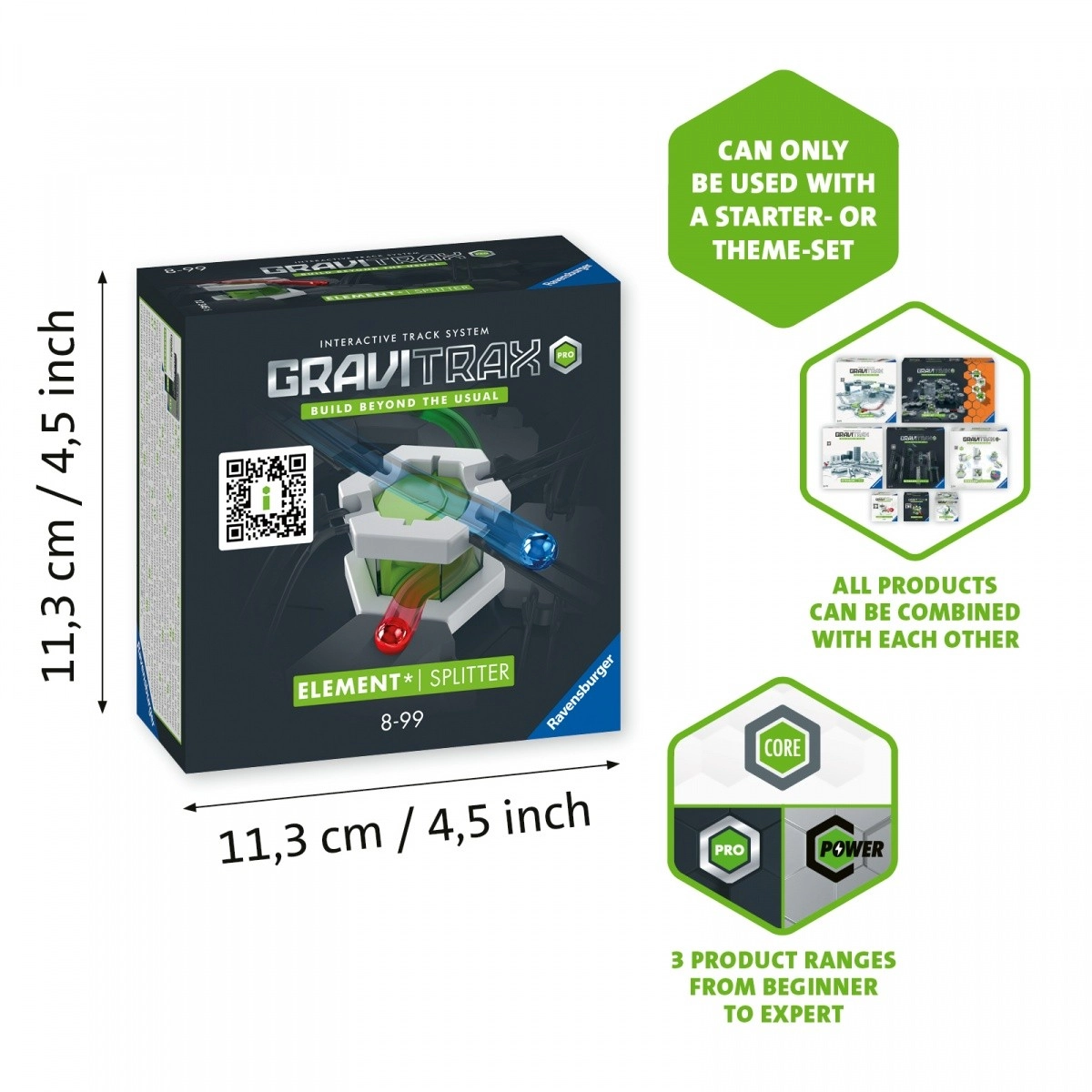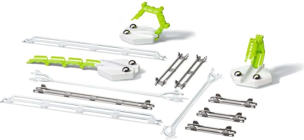 GraviTrax-udvidelser (f.eks. Pro, Vertical, Loops, Bridges) tilføjer sporskifter, broer, loops, katapult, hammer og magnetkanon for uendelige kombinationer, højere fart og spektakulære tricks. Alle dele er indbyrdes kompatible og gør det muligt at bygge storslåede 3D-kuglebaner med gennemtænkt styring af kuglernes flow, skift mellem baner og præcise hop.