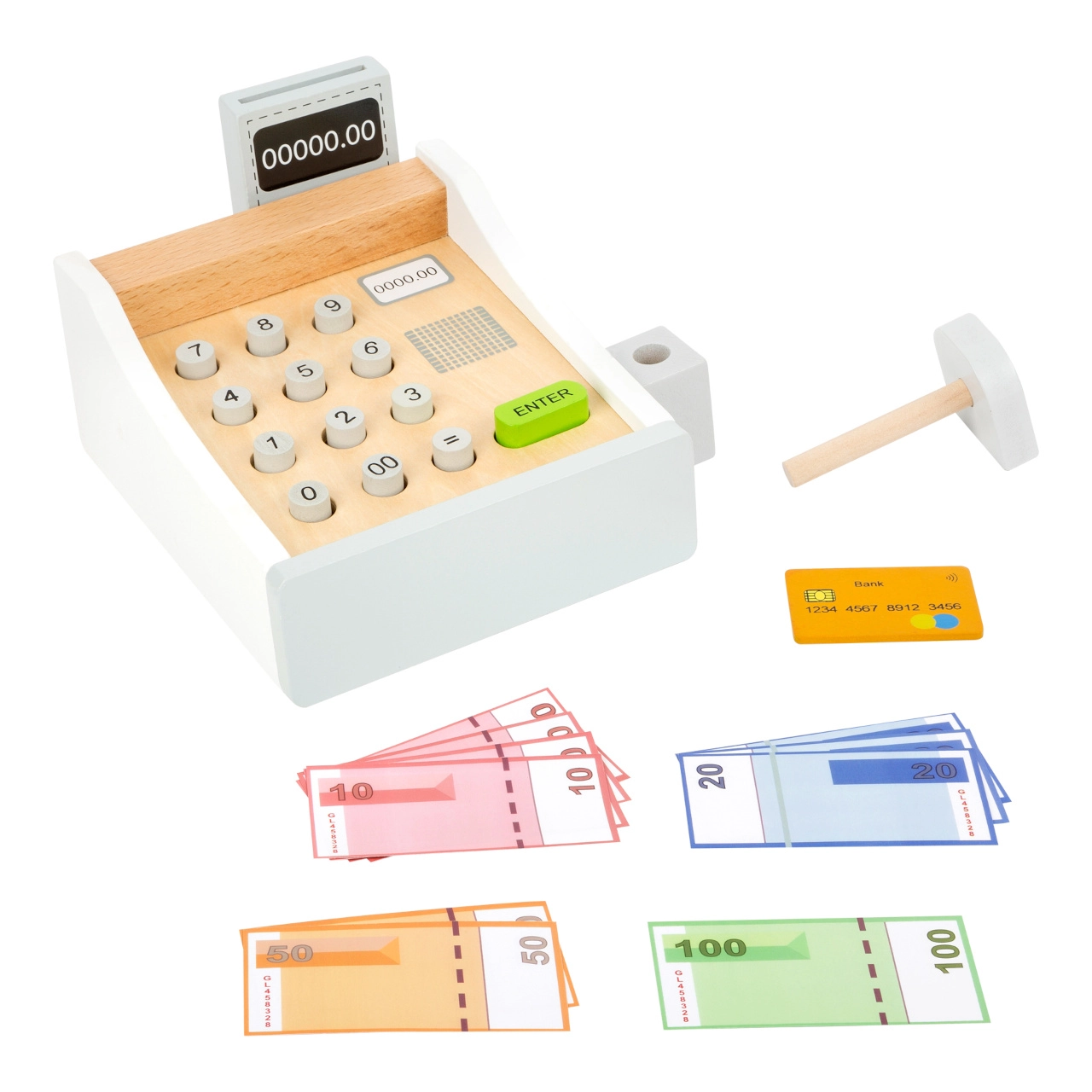 Vælg variant efter alder og præferencer: Et kasseapparat i træ udmærker sig ved robust kvalitet og en behagelig taktil oplevelse, mens et elektronisk kasseapparat tilføjer funktioner som scanner, stregkodelæser og lommeregner. Modeller med kompakte mål, glatte kanter og sikre materialer er lette at betjene og passer perfekt i legehjørnet, butikken eller legekøkkenet. Uanset om du leder efter et børnekasseapparat, en legekasse eller et kasseapparat til børn med betalingskort, finder du her alt til en autentisk butikleg.