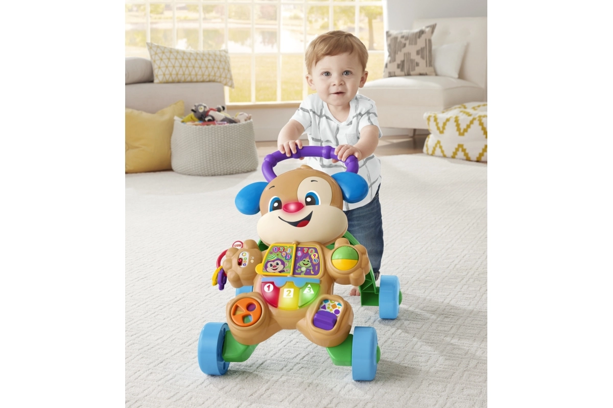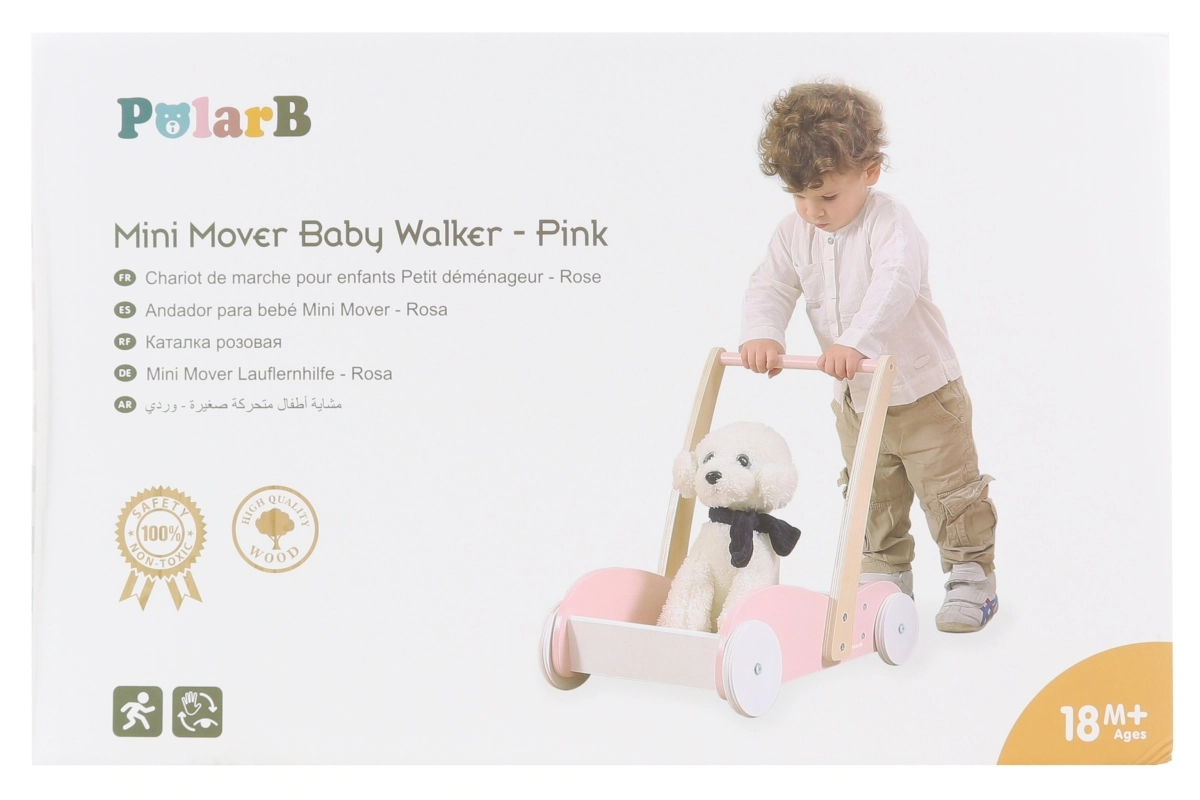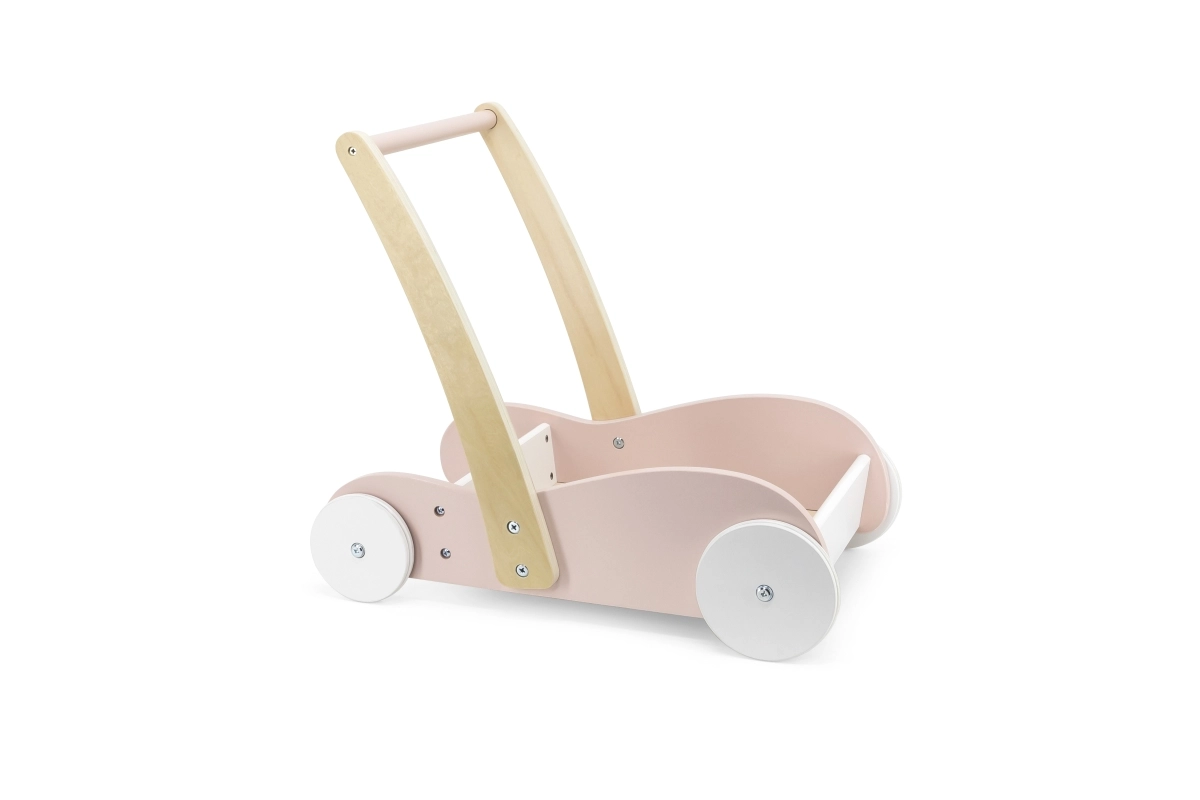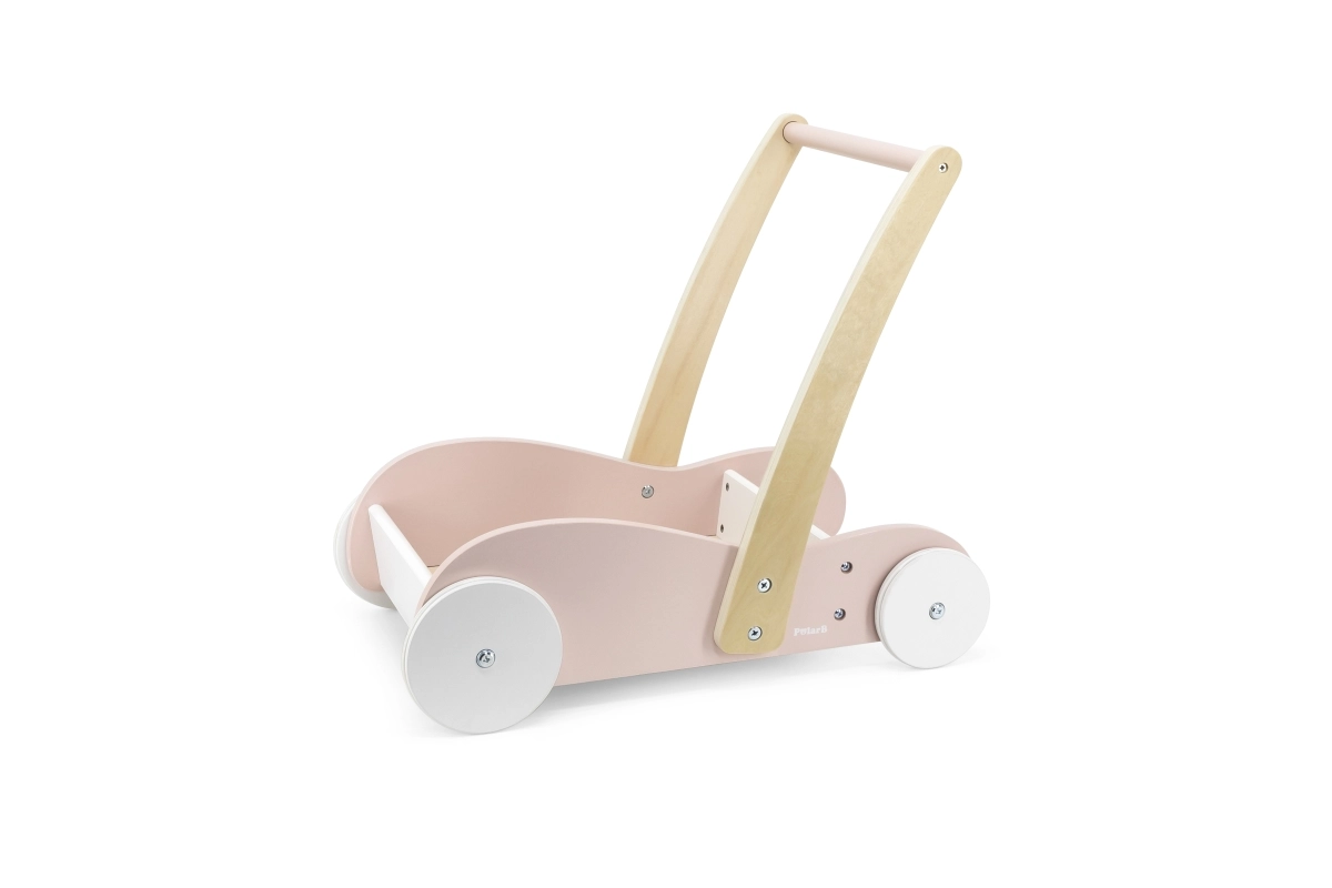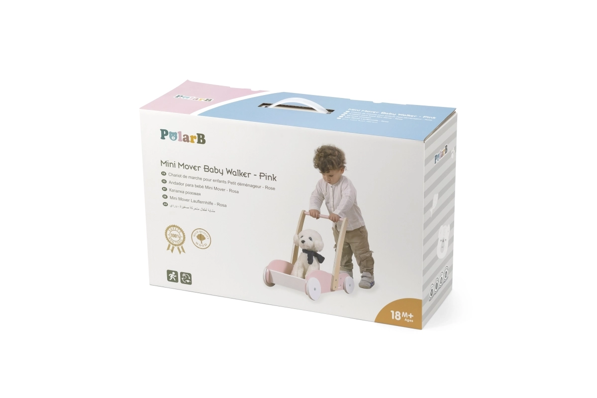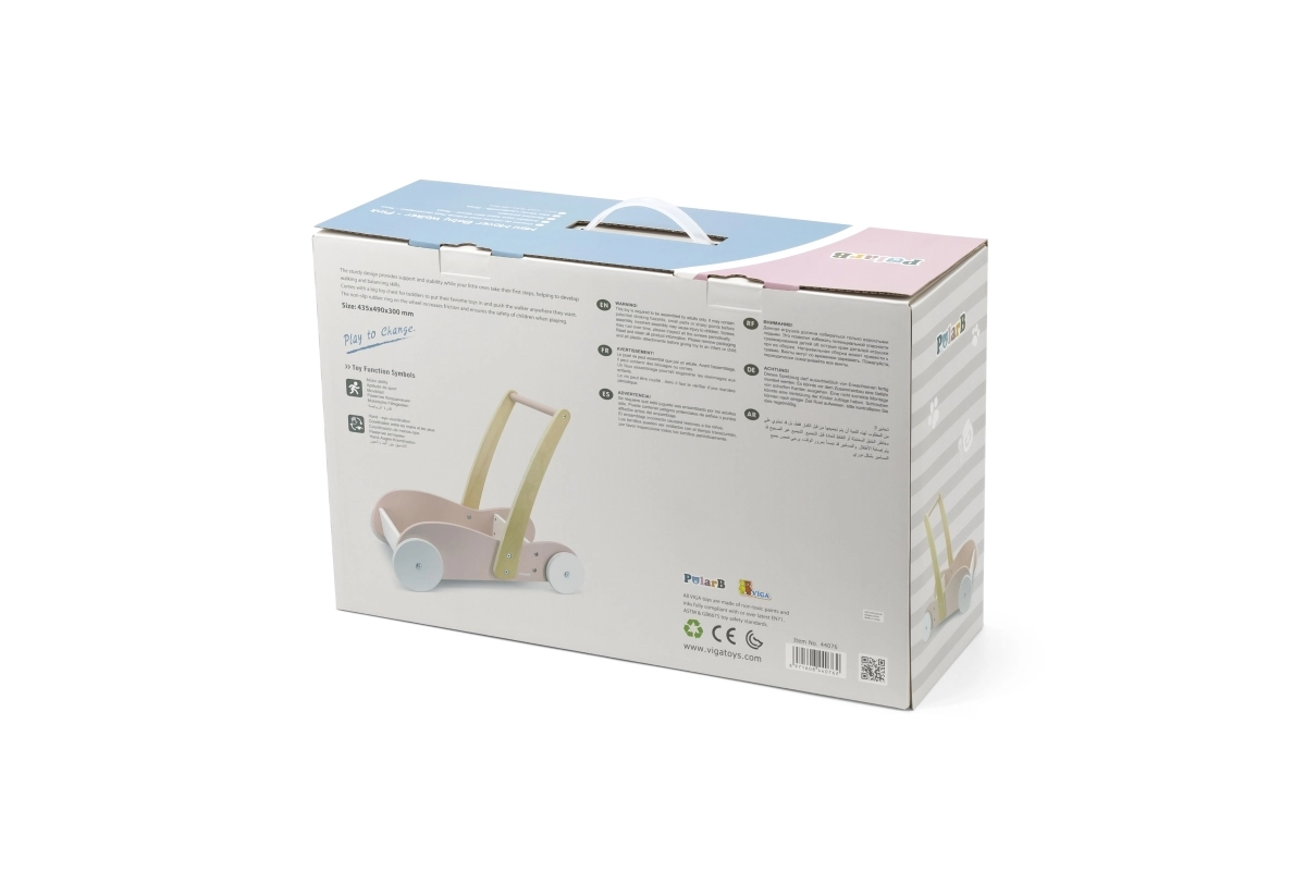Modeller med stabil konstruktion og bred base, med skridsikre elementer og stille gummihjul, eventuelt med bremse eller hjullås, giver barnet tryghed under indlæringen. Et ergonomisk og højdejusterbart håndtag vokser med barnet, aftagelige paneler gør vedligehold nem, og nogle varianter er sammenklappelige og lette for nem transport. Materialer i høj kvalitet uden BPA, afrundede kanter og EN 71-certificering sikrer maksimal sikkerhed ved de første skridt.