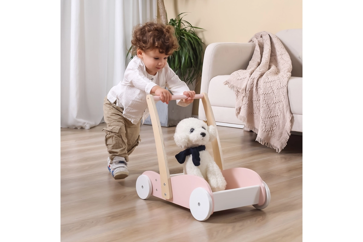 Gåvogne i træ med montessori-aktiviteter, plast-gåvogne med musik- og lys-panel samt multifunktionelle gåvogne med aktiviteter (knapper, former, puttekasser, tandhjul) understøtter sansemotorisk udvikling. Stille hjul skåner gulvet, gummikanter dæmper stød, og mulighed for justering af hjulenes hastighed tilpasser læringstempoet. Gåvogne til børn er velegnede både inde og ude og fremmer selvstændighed, motorisk udvikling og lærerig leg.