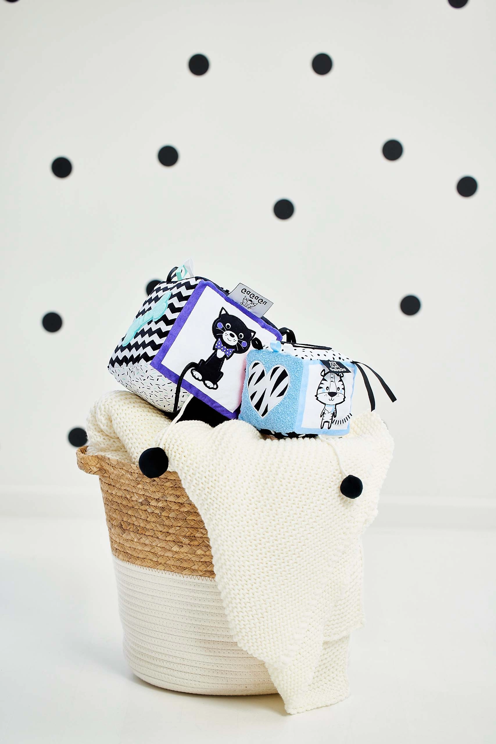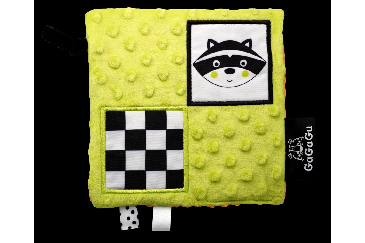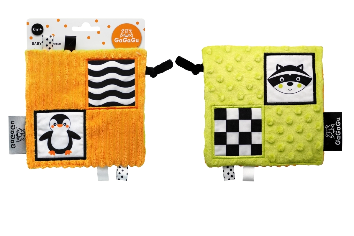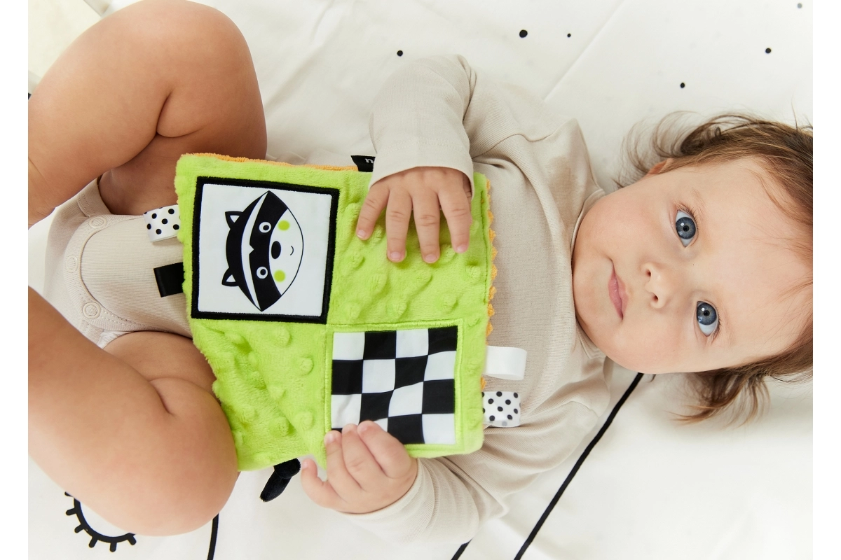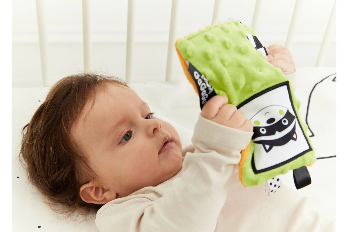 Blandt favoritterne er tekstile nusseklude og krammedyr til trøst, stofbøger og pegebøger til den første “læsning”, rangler og knitrelegetøj med pivelyd, aktivitetskuber og ophængslegetøj til barnevogn eller seng. Forskellige teksturer, sort-hvide kontrastmønstre samt sikkert fastsyede mærker og knuder indbyder til berøring og stimulerer sanseudvikling, finmotorik og øje–hånd-koordination i tråd med Montessori-inspiration.