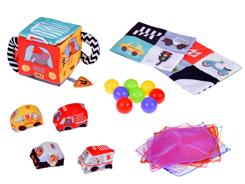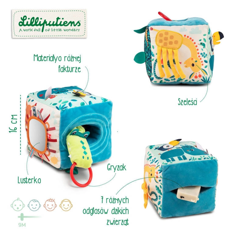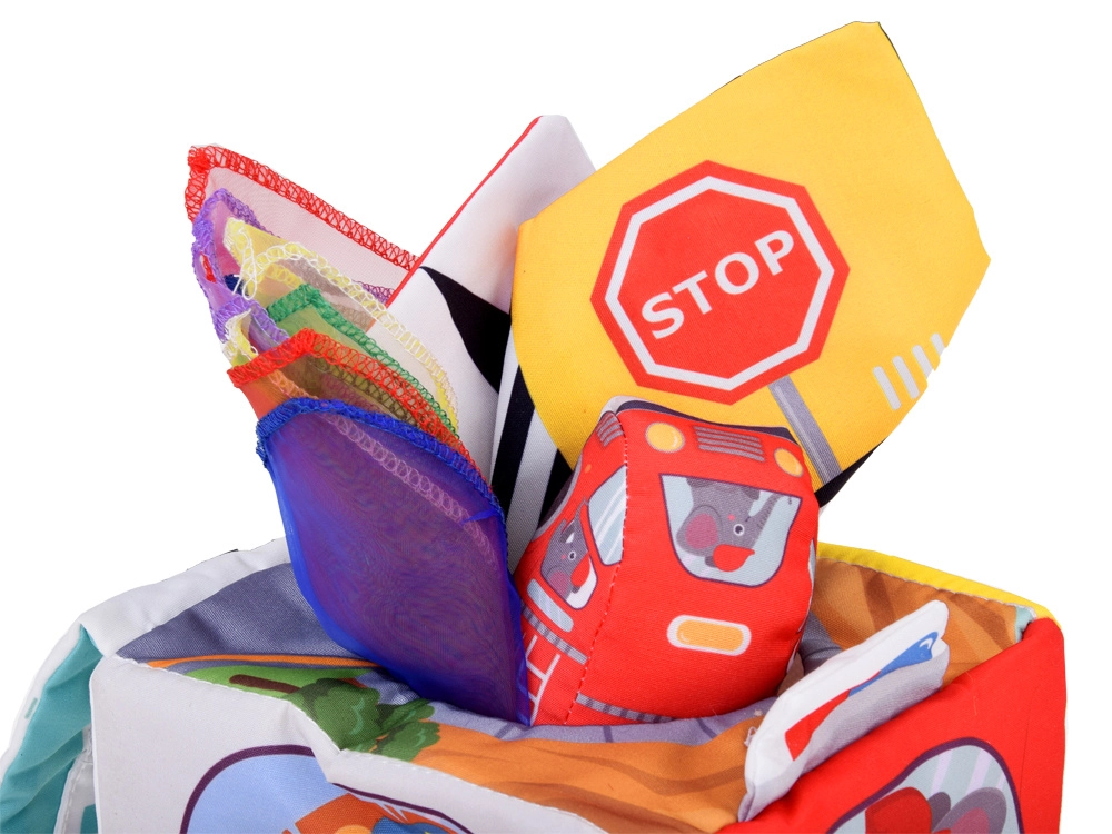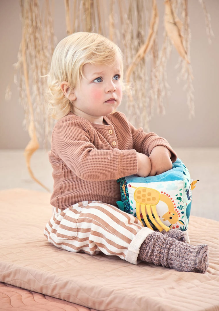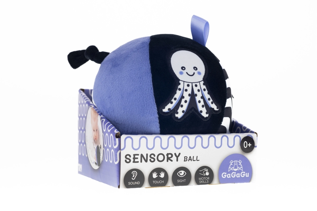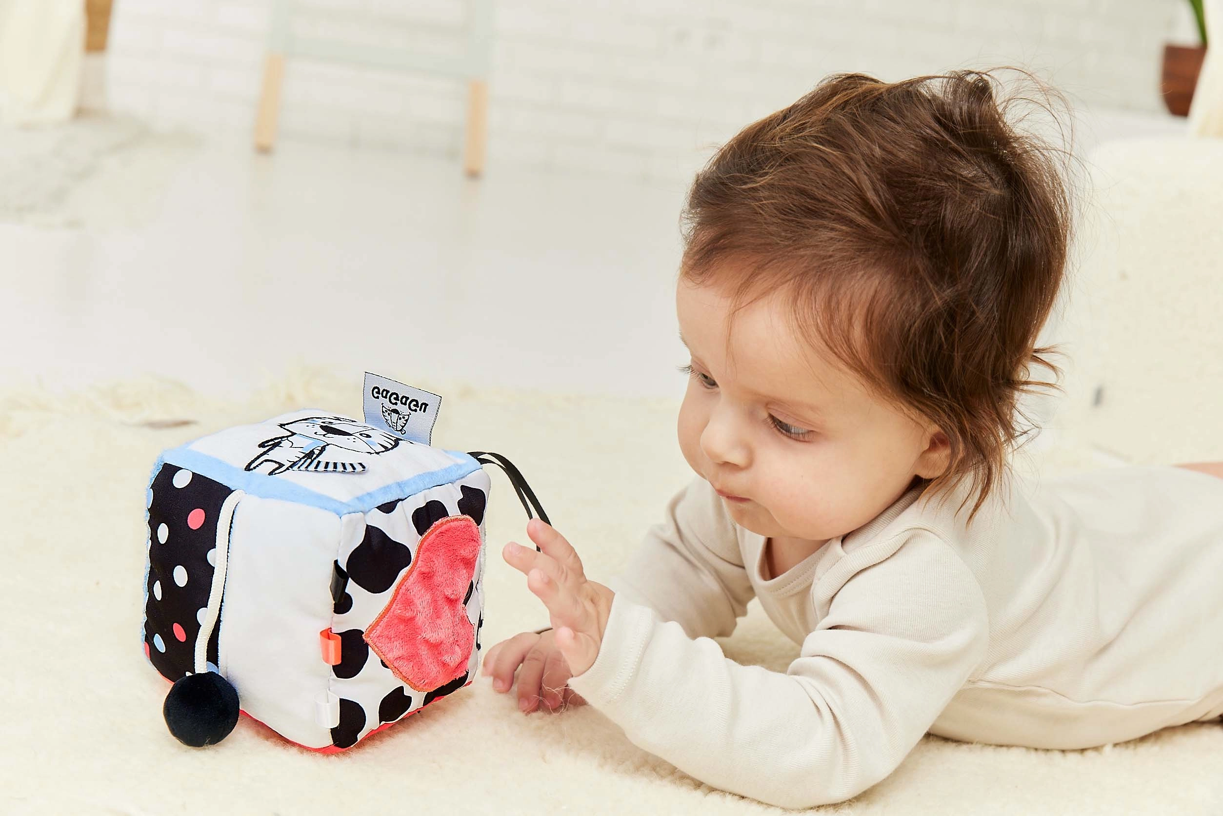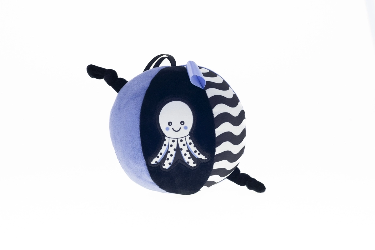 Blandt favoritterne er tekstile nusseklude og krammedyr til trøst, stofbøger og pegebøger til den første “læsning”, rangler og knitrelegetøj med pivelyd, aktivitetskuber og ophængslegetøj til barnevogn eller seng. Forskellige teksturer, sort-hvide kontrastmønstre samt sikkert fastsyede mærker og knuder indbyder til berøring og stimulerer sanseudvikling, finmotorik og øje–hånd-koordination i tråd med Montessori-inspiration.