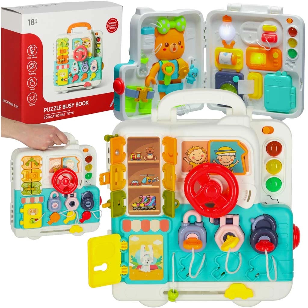 Hver motorikplade gemmer på finurlige elementer: lynlåse, spænder, snørebånd, låse, tandhjul, skydeknapper, labyrinter, kontakter, velcro, kugleramme eller former. Børn øver praktiske færdigheder (lukke lynlås, binde snørebånd), udvikler sanseopfattelse og problemløsning. Glatte overflader, vandbaserede farver og robust udførelse sikrer behagelig og sikker leg.