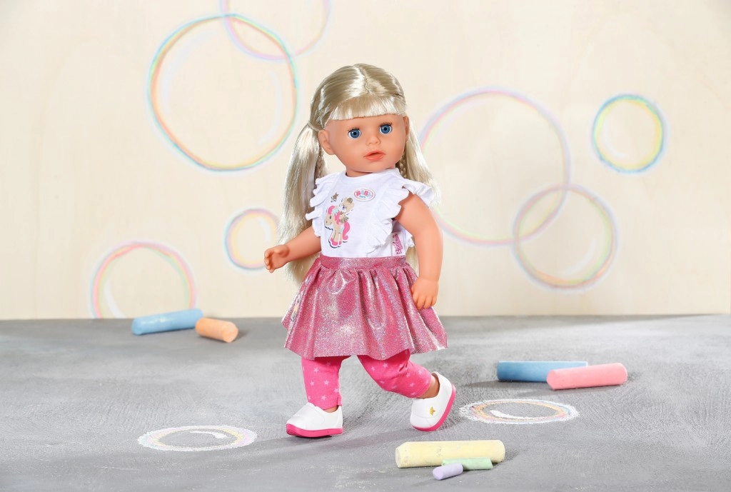Den mest almindelige størrelse er dukke 43 cm: den drikker af sutteflaske, tisser på potte, kan græde med tårer og kan fodres med grød; udvalgte modeller er også velegnede til bad. Bevægelige lemmer, en behageligt blød krop og høj kvalitet gør det nemt at klæde på og lege realistisk. Supplér med rigt tilbehør og BABY born-tøj – sutteflasker, sutter, bleer, potter, badekar, barnevogne, senge, bærerseler og tematiske spisesæt.
