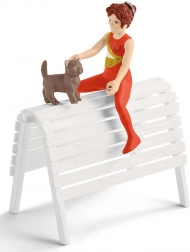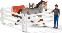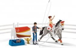 Der medfølger en træningscirkel af hegnselementer, en træner med line og pisk til rolig føring af hesten, en opbevaringsbænk til udstyret og en stor gylden pokal til mesteren. Legen udvikler finmotorik, fantasi og kærlighed til dyr.