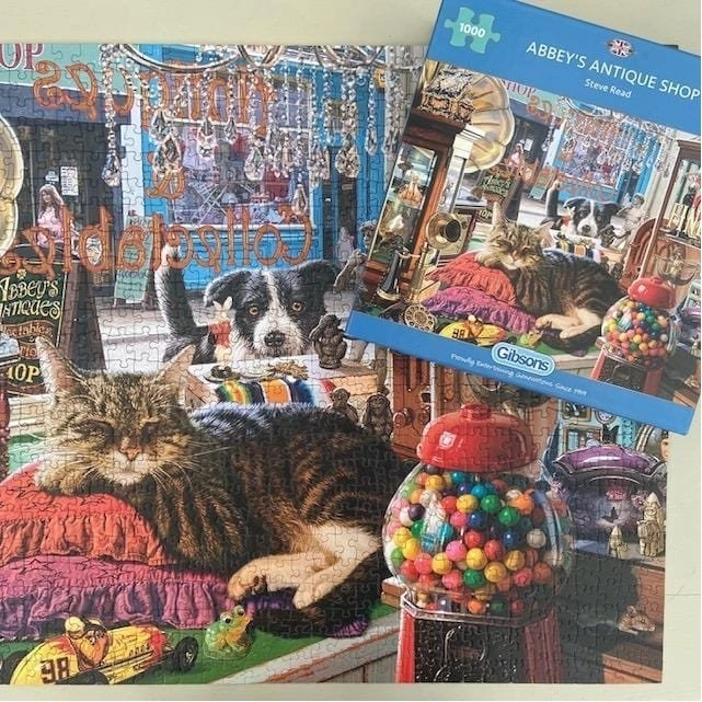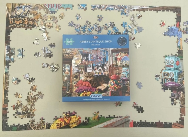 GIBSONS puslespil Antikvitetsbutikken ved klosteret med 1000 brikker. Færdig størrelse 68 × 49 cm. En fantastisk gave og afslappende udfordring for puslespilselskere.