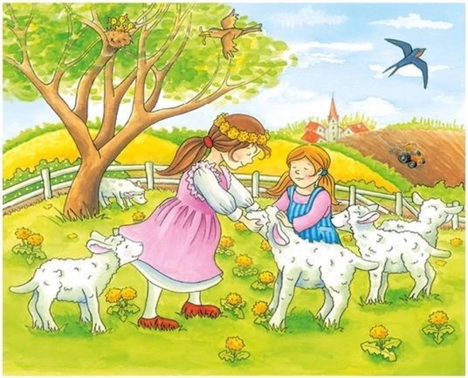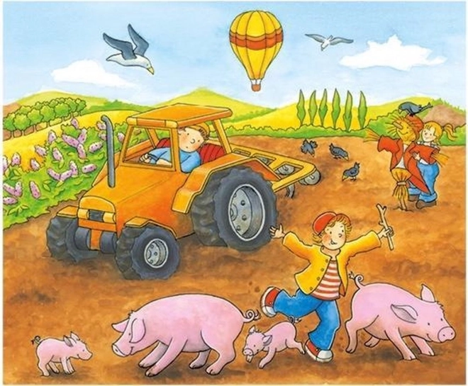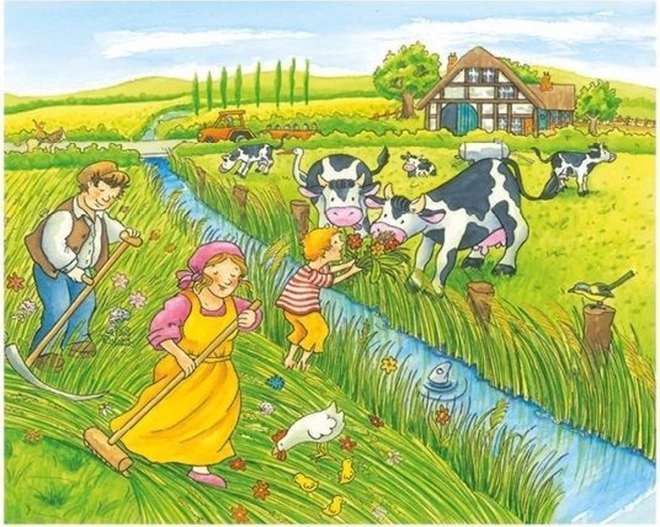 Udforsk livet på landet med dyr og mennesker gennem hele året. Af 12 solide træklodser samler I 6 illustrerede scener – fra forårsgården over sommerens arbejde til vinterglæder. Klodserne er ideelle til førskolebørn, udvikler øje–hånd-koordination og lærer børn at forstå forholdet mellem dele og helhed.