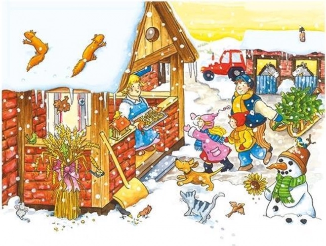 Vinterbilledet med snemand, børn og dyr stimulerer fantasien og motiverer til fælles historiefortælling.