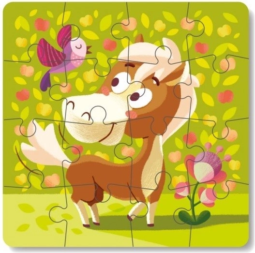 Sødt DODO puslespil med motiv af en lille hest, som vil glæde små puslespilsentusiaster. Indeholder 16 brikker og måler efter samling 22 × 22 cm – ideelt til de første forsøg og til at udvikle finmotorik.