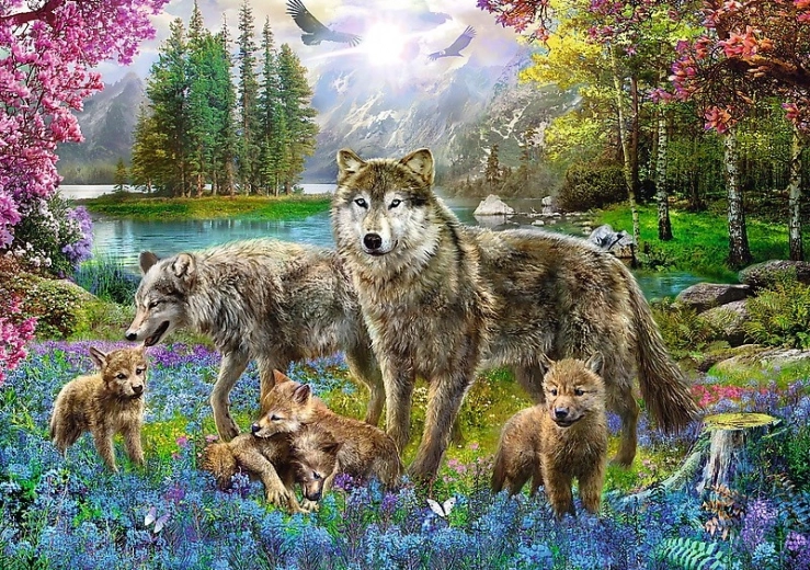 Puslespil 1000 brikker med motiv af ulvefamilie. Høj kvalitet, kalandreret papir mod genskin, størrelse 683 × 480 mm, miljøvenlige materialer, fremstillet i Polen.