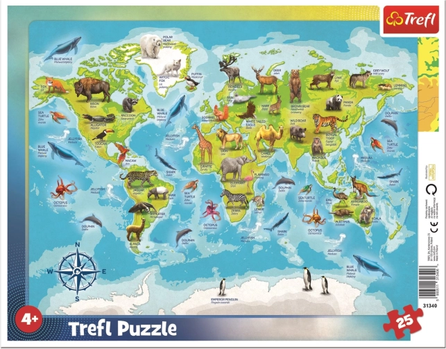 Tag ud på en eventyrlig rejse rundt i verden med dette spændende puslespil fra virksomheden TREFL. Billedet indeholder forskellige kontinenter og dyr, der lever i hvert område, og på puslespillet er dyrenes navne angivet på engelsk og polsk. Puslespillet er specielt designet til børn fra 4 år for at fremme deres kreativitet og finmotorik.