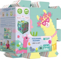Sjovt og sikkert skumpuslespil med søde lamaer til børn fra 2 år. Underlaget af kvalitetsmateriale med ekstra tykkelse på 1,5 cm er blødt, afvaskeligt og sundhedsmæssigt ufarligt. Af otte dele kan du samle en legeflade, en terning eller en tunnel, og efter legen tørrer du det nemt af med en fugtig klud.