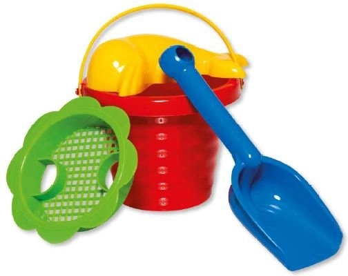Sættet inkluderer en spand med en højde på 11 cm, en skovl, en form og en sigte – det grundlæggende udstyr til at bygge slotte, lave figurer og flytte sand. Farverne kan variere, hvilket gør hvert sæt unikt.