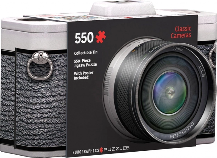 Stilfuldt puslespil i en tinæske formet som et klassisk kamera, der vil begejstre både samlere og puslespilsentusiaster. Indeholder 550 brikker med specialforme, en separat forlæg, og måler efter samling ca. 48 × 33 cm. Det aftagelige låg forvandler æsken til en original dekoration.