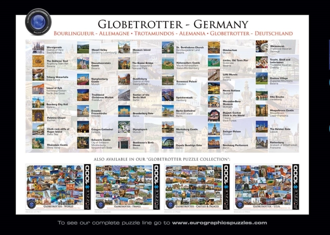 Oplev Tysklands skønhed med et kvalitets‑puslespil fra EUROGRAPHICS med 1000 brikker. Takket være en unik stansematrice med uregelmæssige former er lægningen både en udfordring og en fornøjelse. Det færdige mål er ca. 68 × 48 cm. Unikke brikformer, højere sværhedsgrad og et detaljeret kort over Tyskland vil glæde enhver puslespils- og rejseentusiast.