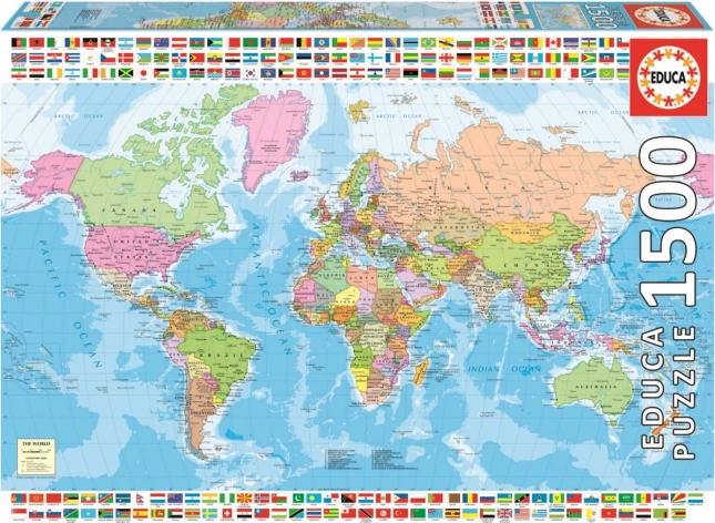 Opdag verden med et kvalitetspuslespil fra EDUCA med 1500 brikker, der viser et detaljeret politisk verdenskort. I pakken medfølger gratis lim til nem fastgørelse af det færdige billede på ca. 85 × 60 cm.