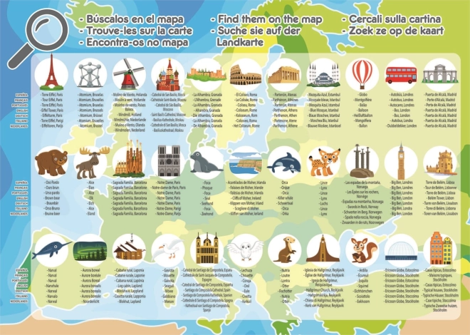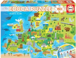 Educa puslespil Kort over Europa er en fantastisk måde at ikke kun underholde børnene, men også lære dem noget! Indeholder navne på have og oceaner på engelsk og en informationsbrochure med navne på dyr eller seværdigheder på flere europæiske sprog.