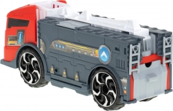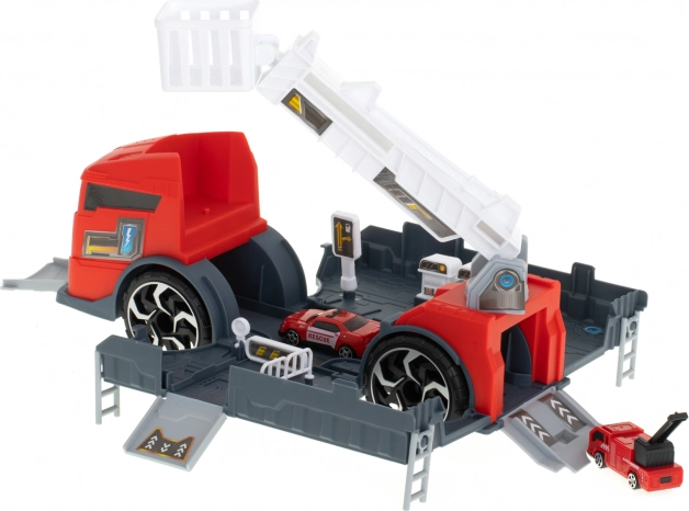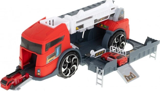 Brandbilen fungerer som en transporter, der transporterer de medfølgende modelbiler ved hjælp af en rampe.