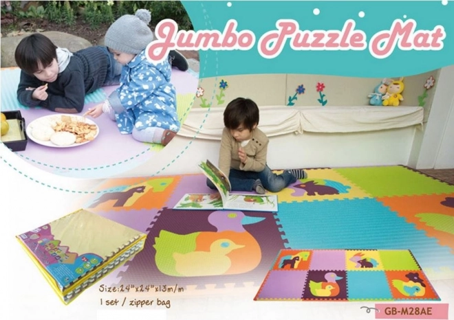 Dette skumpuslespil består af otte store firkantede brikker og tolv kantstykker, som tilsammen danner en størrelse på ca. 244 x 124 cm. Hver brik måler 60 x 60 cm, uden kant fra tap til udskæring. Den sikre, bløde og vaskbare måtte dæmper støj og isolerer mod kulde, hvilket gør den ideel som legetæppe på børneværelset.