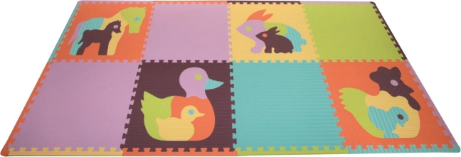 Stor legeflade med motiv af farverige dyr. Skumpuslespil i moderne farver og med forskellige overfladestrukturer giver et sikkert og blødt miljø til leg og understøtter udviklingen af motorik og fantasi hos børn.