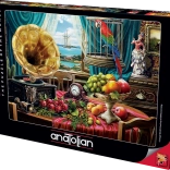 Dette puslespil med et motiv af et stilleben med frugt og en grammofon er en fantastisk måde at tilbringe fritiden på og samtidig forbedre dine færdigheder i at lægge puslespil. Det er et ideelt valg for elskere af puslespil og kunst, der ønsker at skabe et smukt billede.