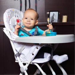 Praktisk og stabil højstol til børn, der kan sidde selvstændigt, op til 15 kg. Behagelige materialer, sikker 5-punkts sele og justerbar fodstøtte i 3 niveauer giver komfort ved hvert måltid. Den rummelige bakke med plads til kop er let at holde ren.