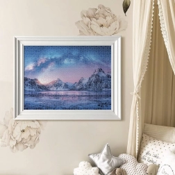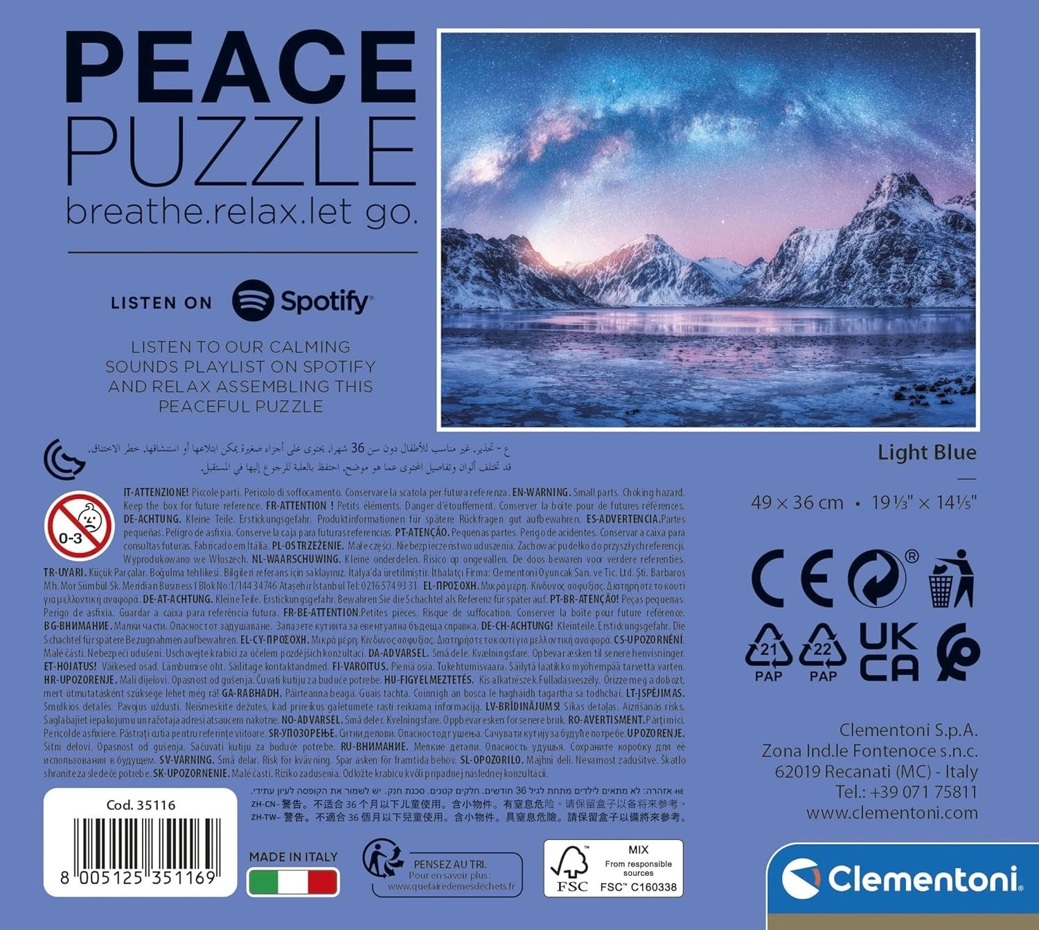 Nyd stille stunder med CLEMENTONI Peace Collection Light Blue. De førsteklasses brikker af kvalitets, kraftig karton passer perfekt sammen, og motivet af et roligt nordisk landskab med glitrende himmel skaber den ideelle atmosfære til meditativ lægning.