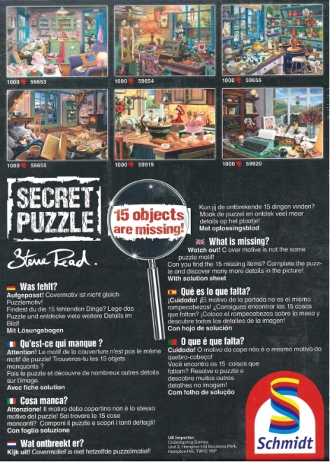 Sæt din koncentration og dine detektivevner på prøve med Secret-kollektionen fra Schmidt. Dette unikke puslespil byder på 15 forskelle, som du kun opdager under selve lægningen. Det, du ser på æsken, er ikke det, du får på pladen. Det er tid til at undersøge hver brik og afsløre den skjulte sandhed!