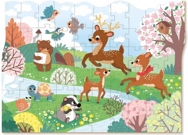 DODO børnepuslespil med forårstema: 60 brikker, 32 × 23 cm, konturkant og mulighed for at forbinde med andre scener. Ideelt valg til børn fra 4 år.