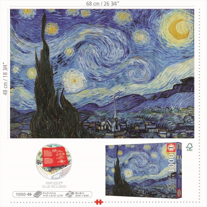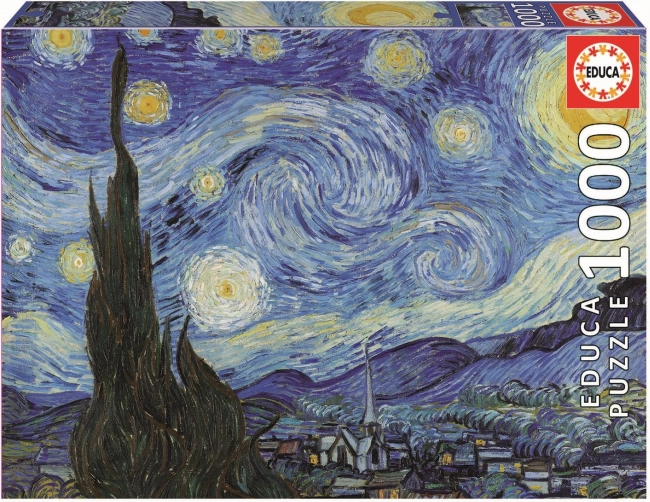 Nyd afslapning og underholdning med det smukke EDUCA-puslespil inspireret af mesterværket Stjernenatten. Pakken indeholder 1000 brikker og FIX PUZZLE-lim gratis for nem fastgørelse af det færdige billede. Når det er samlet, måler puslespillet cirka 68 × 48 cm – en ideel størrelse til indramning og udstilling.