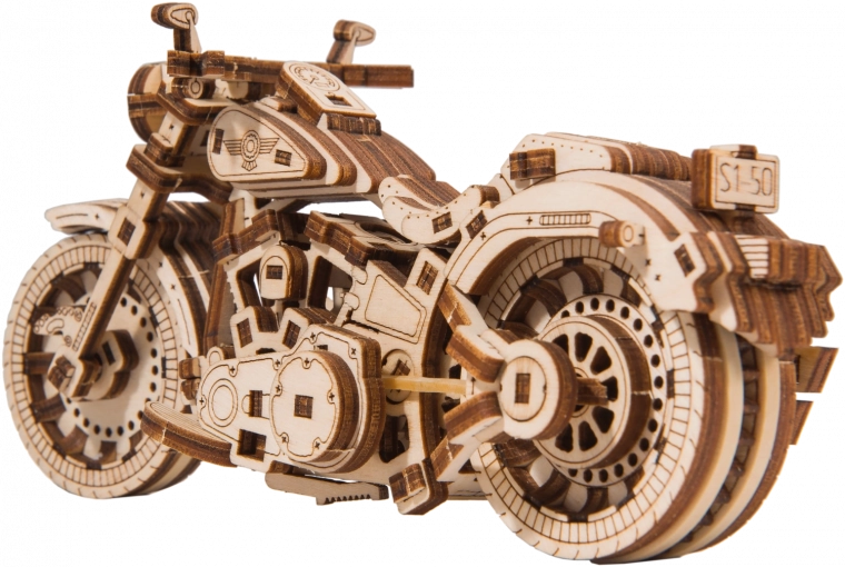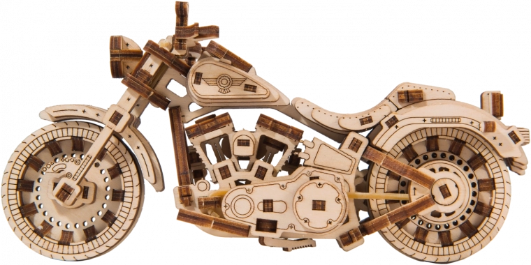 Den mekaniske træbyggesæt af den mest imponerende Cruiser V-Twin venter på dig! Takket være det unikke design og de overraskende detaljer vil din tid være fuld af sjov og fantastiske oplevelser. Du kan styre ved hjælp af forhjulet. Motorcyklen med svinghjuls-mekanisme kan køre op til 1 meter. Du vil blive begejstret over de bevægelige cylindre, når baghjulet drejer, samt støddæmperne i den forreste gaffel. Cruiser V-Twin er udstyret med bremseskiver og gummibelagte hjul.