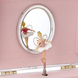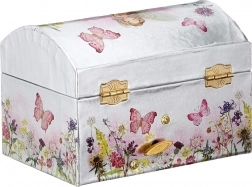 Dette smykkeskrin i spilledåse-stil forener ynde og funktionalitet. Det sølvfarvede, blanke udtryk ledsages af fine blomster- og sommerfuglemotiver; indeni finder du et ovalt spejl og en roterende ballerina. Når låget åbnes, spiller den berømte melodi fra Svanesøen, som ledsager hver gang ringe eller øreringe lægges forsvarligt på plads.