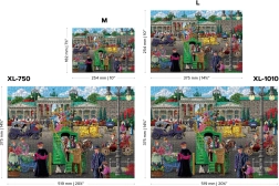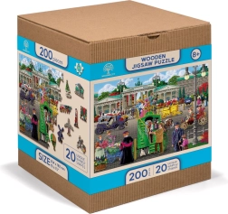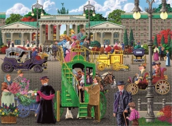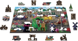 Dette træpuslespil byder på et attraktivt motiv af en livlig historisk gade og giver dobbelt fornøjelse takket være det dobbeltsidede design – forsiden lægges efter billedet, mens bagsiden lægges efter et gentaget mønster og former. Laserfremhævede detaljer og særligt formede brikker i form af dyr, bygninger og genstande giver en ny dimension til oplevelsen.