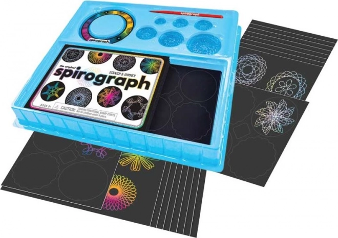 Sættet Spirograph Scratch & Shimmer bringer klassisk spirograf-sjov i en ny form. Den sorte voksoverflade på papirerne afslører regnbue- eller shimmer-farver efter gravering, så hvert motiv træder frem. Med forskellige skabeloner og tandhjul skaber du nemt mandalaer, ornamenter og originale billeder.