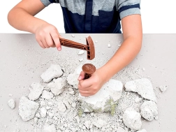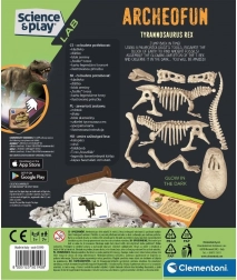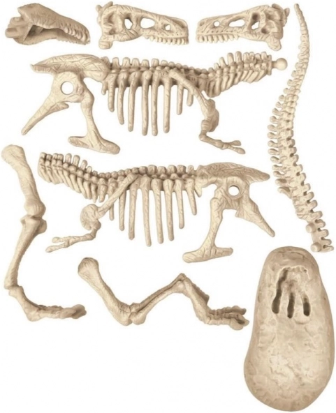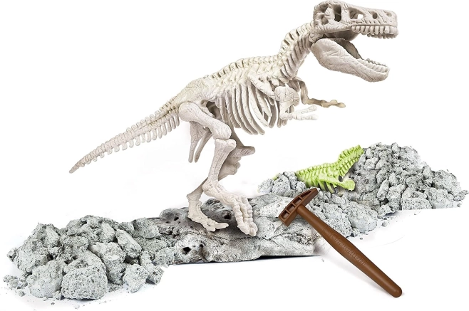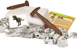 Sættet indeholder en jordblok, en hammer og en mejsel. Børn kan prøve ægte udgravninger og derefter samle et detaljeret T‑Rex‑skelet af de fundne dele.