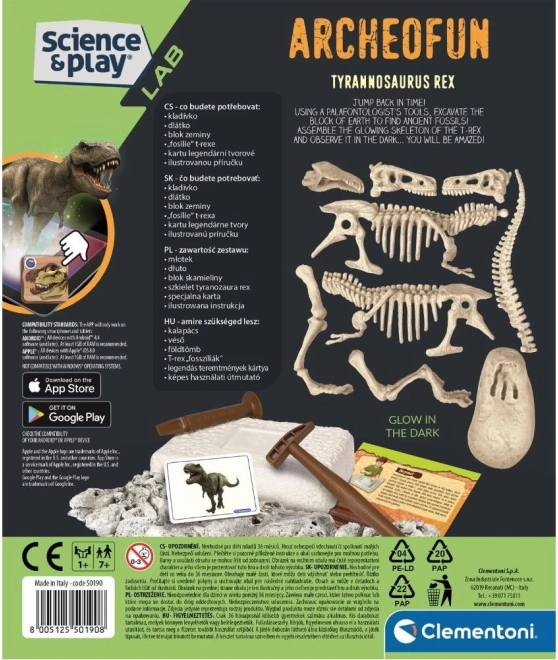 Bliv en lille palæontolog med læringssættet CLEMENTONI Archeo Fun: T‑Rex! Med de medfølgende værktøjer udgraver og samler du et lysende T‑Rex‑skelet, opdager fossilers hemmeligheder og vækker dinosauren til live i en app med udvidet virkelighed. Sjov aktivitet, der udvikler fingerfærdighed, kreativitet og interesse for videnskab.