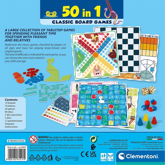 En æske fuld af sjov for hele familien! Dette alsidige sæt byder på 50 forskellige brætspil på 5 dobbeltsidede spilleplader, for både børn og voksne. Indeholder alt, hvad du behøver for at komme hurtigt i gang, vejledninger på CZ/SK/PL/HU og spil med forskellige sværhedsgrader. En fantastisk gave til hyggelige stunder sammen.