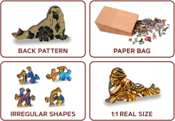 Hver brik er udskåret af robust HDF-plade i 3–4 mm tykkelse, hvilket garanterer lang levetid og behagelig lægning uden splinter. I pakken finder du også en separat forlæg for nemmere orientering. WOODEN CITY’s bæredygtige tilgang betyder 100% øko-emballage uden plast – puslespillet ligger i en papirpose og æske.