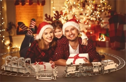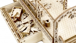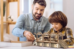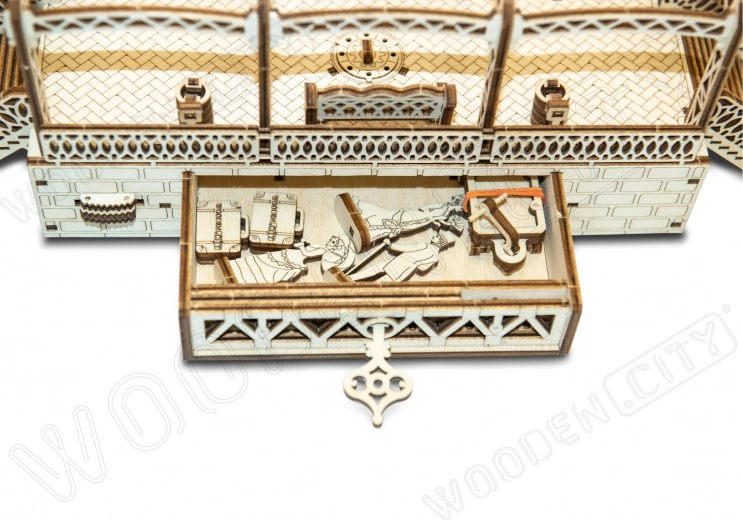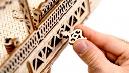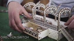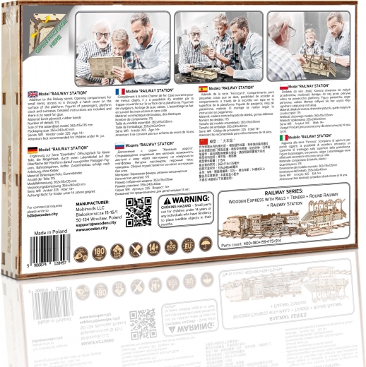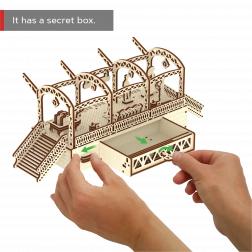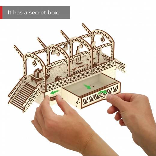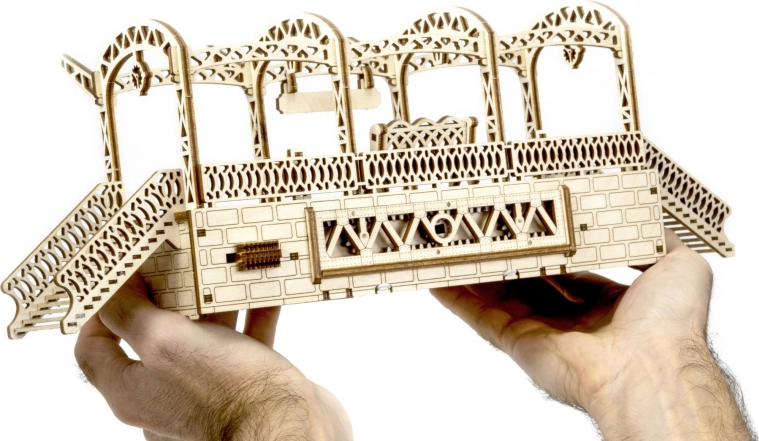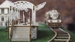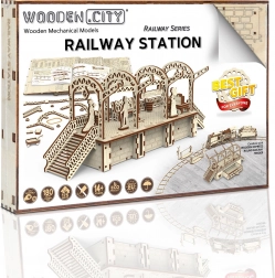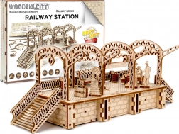 Træ 3D‑puslespil WOODEN CITY jernbanestation bringer autentisk stationsstemning med dekorative buer, bænke og passagerfigurer. Samlingen foregår uden lim eller værktøj; de enkelte dele passer præcist, og den færdige model er ikke kun dekorativ, men også funktionel – småting gemmes nemt i det hemmelige rum.