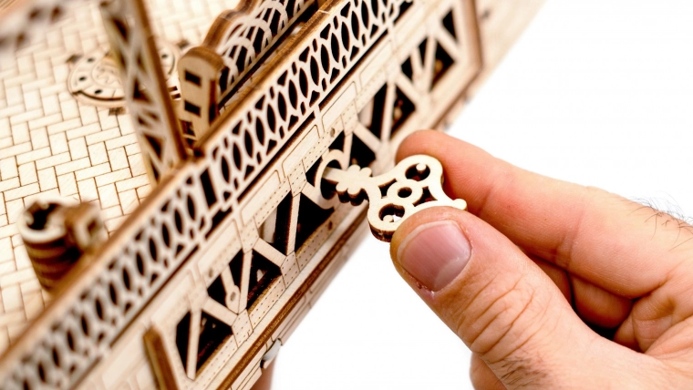Præcise udskæringer, tandhjul og jævn bevægelse efter voksning. Samlingen foregår rent – delene passer præcist sammen uden behov for lim.