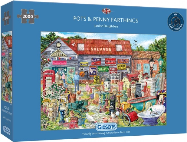 Oplev nostalgien med det store puslespil fra Gibsons – Potter og ragelse for en skilling med 2000 brikker. En detaljeret illustreret gårdscene fuld af skatte venter på dig, som vil begejstre både antik-elskere og krævende puslespilsentusiaster. Inkluderer motivskabelon, og når det er lagt, får du et kvalitetsbillede i stort format på 98 × 68 cm.