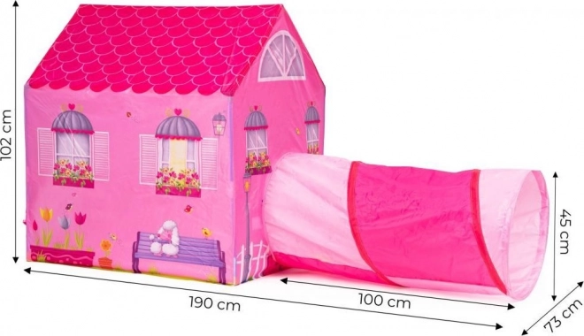 Legetelt til børn med tunnel med motiv af et lyserødt lille hus.