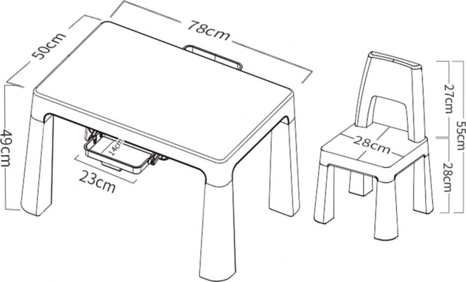Bordet kan justeres i to højder, så det vokser med dine børn. To praktiske skuffer (23 × 14 cm) holder farver, blokke og andre småting lige ved hånden. Sættet er kompakt og stabilt, ideelt til børneværelse, legeværelse, stue og til haven.