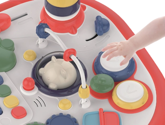 Sjovt interaktivt bord til de mindste, som udvikler sanser, finmotorik og kreativitet. Det byder på lys- og lydeffekter, tostyret lydstyrke, en drejelig plade med side til byggeklodser som lego samt masser af knapper, tandhjul og legeelementer. Panelet kan tages ud, og bordet kan også bruges som en opbevaringsboks til legetøj.