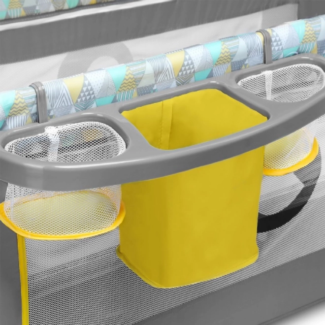 Det rige tilbehør inkluderer puslebord, ophængt indsats til nyfødte (2 højdepositioner), sidepanel med 3 lommer og myggenet. Sideindgangen med lynlås og sikkerhedslås gør det muligt for større børn selv at gå ind og ud. Til underholdning er der melodier og en interaktiv hund, mens hjul med bremse gør det let at manøvrere både indendørs og på tur.