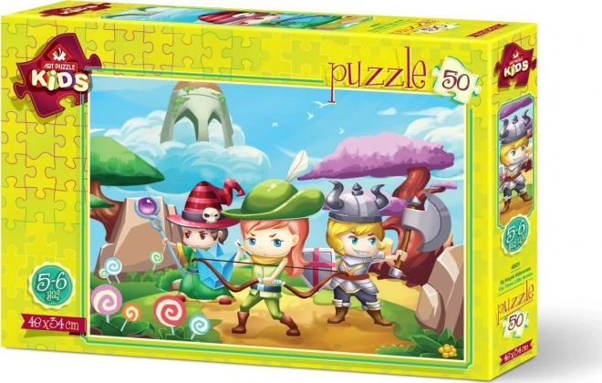 Opdag sjov for de mindste med et kvalitetspuslespil med 50 brikker, som udvikler logisk tænkning, tålmodighed og finmotorik. Motivet “Tre små helte” glæder både børn og forældre og måler efter samling cirka 48 × 34 cm.