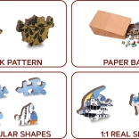 Laserudskåret træpuslespil fra WOODEN CITY med specialformede brikker er utroligt underholdende. En del af brikkerne er udformet som dyr, bygninger eller genstande, hvor laserfremhævede detaljer forstærker den endelige effekt. Disse brikker kan stå selv som små figurer. At lægge et puslespil med forskelligformede brikker er sværere og udgør en større udfordring end et klassisk puslespil. Puslespillet er desuden dobbeltsidedt: du kan lægge efter motivet (forsiden) eller efter formen (bagsiden med mønster). Mærket WOODEN CITY glemmer heller ikke økologi; derfor finder du ingen plastemballage på disse produkter.