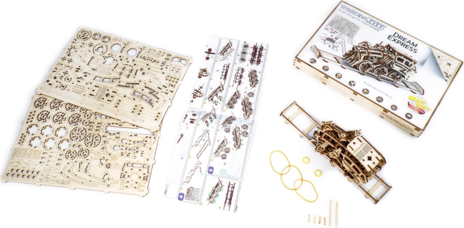 Modellen Drømmenes Ekspres er udstyret med drivhjul og kan bevæge sig fremad, bagud og i cirkler. Den opnår en distance på op til 3 meter ved fuld optræk af elastikmotoren. Det er en fremragende måde for både børn og voksne at blive bekendt med principperne for mekanik og fingerfærdighed under samlingen. Pakken indeholder en illustreret vejledning, som gør det nemmere at samle modellen.