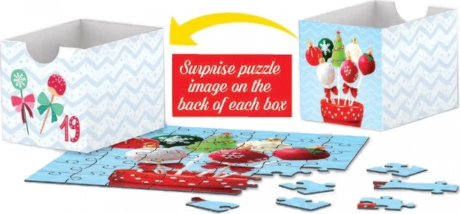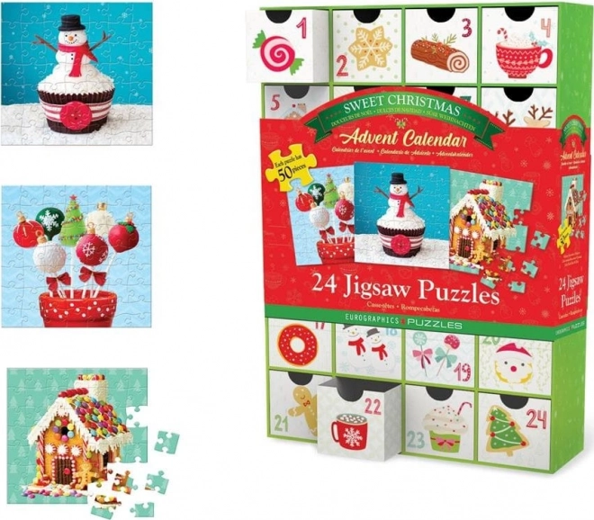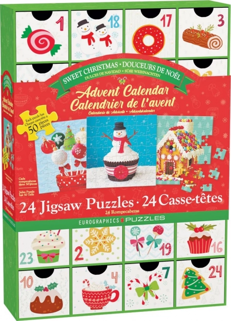 Gør ventetiden til jul kortere med den originale EUROGRAPHICS adventskalender. Hver dag opdager du et nyt mini-puslespil med temaet søde sager. Sættet indeholder 24 forskellige motiver, hver med 50 brikker, i en praktisk genanvendelig kalender med små skuffer.